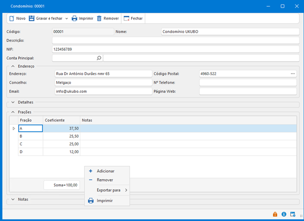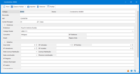 - Separador Endereço: colocar a morada do condomínio (endereço, código-postal e concelho), telefone e email;