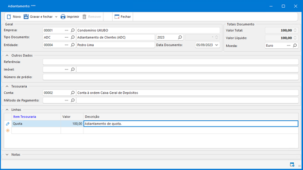 - Imóvel: caso esteja a lançar um adiantamento de cliente, selecione a fração à qual ficará associado o documento;