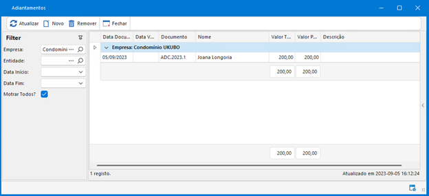 - Tesouraria | Adiantamentos | Novo;