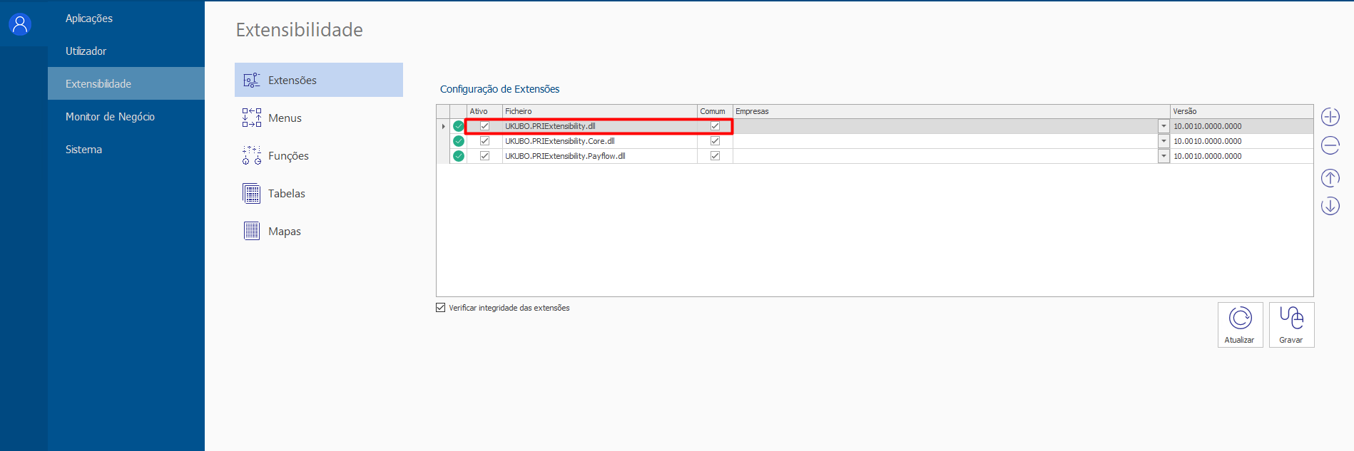 3. Adicionar a extensão UKUBO.PRIExtensibility.Payflow.dll, disponível na pasta comum à pasta de instalação do serviço de integração com a designação PRIExtensionsV10;